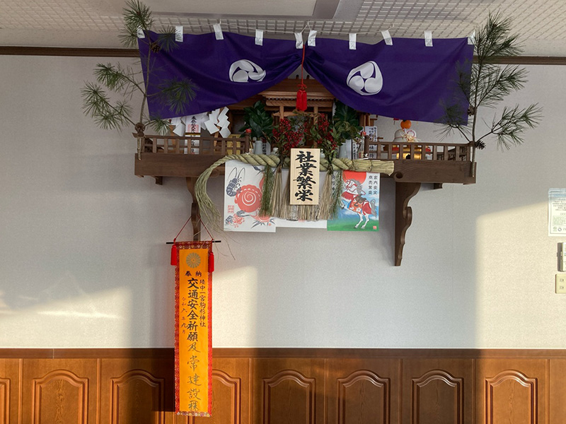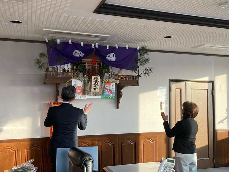仕事始め式に先立ち社内の神棚に拝礼。